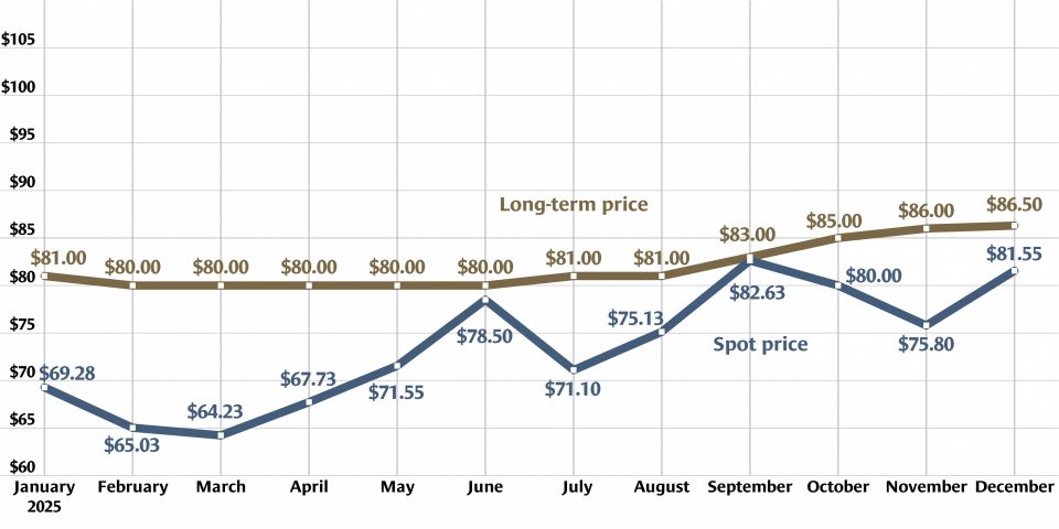 The spot price of uranium at the end of November declined to $75.80 per pound, down from $80.00/lb at the end of October, according to uranium company Cameco. The high-water mark this year was...
