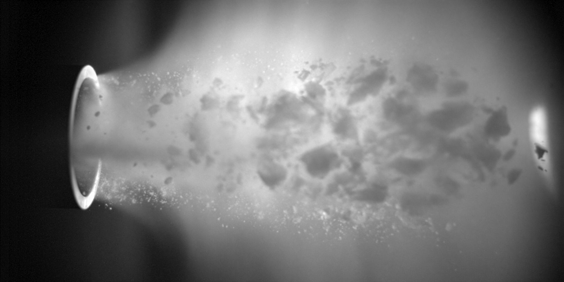 The fragment plume from a shattered pellet injection experiment at ORNL. Shattered pellet injection technology developed at ORNL is deployed on fusion devices all over the world and will inform the design of the disruption mitigation system for ITER. (Photo: Trey Gebhart/ORNL)