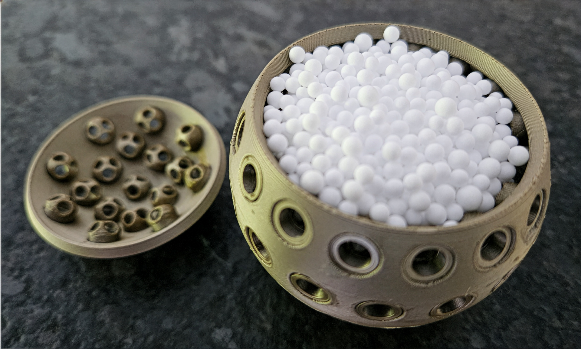 A component mock-up from ORNL’s nested pebble bed blanket (NesPeB) concept, which uses beryllide shells filled with lithium-ceramic tritium breeder pellets in a gas-cooled bed behind the first wall. This design provides excellent heat transfer and a high tritium breeding ratio using natural lithium. (Image: Vittorio Badalassi/ORNL)
