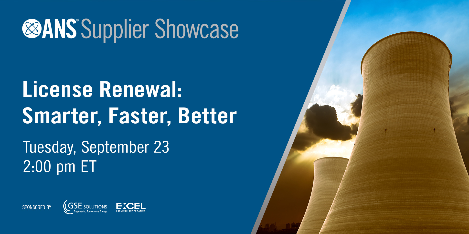 The American Nuclear Society is hosting a Supplier Showcase webinar, “License Renewal: Smarter, Faster, Better,” tomorrow, September 23, from 2:00 p.m. to 3:00 p.m. (ET) on the increasing urgency of submitting license renewals and subsequent license renewals both efficiently and accurately.