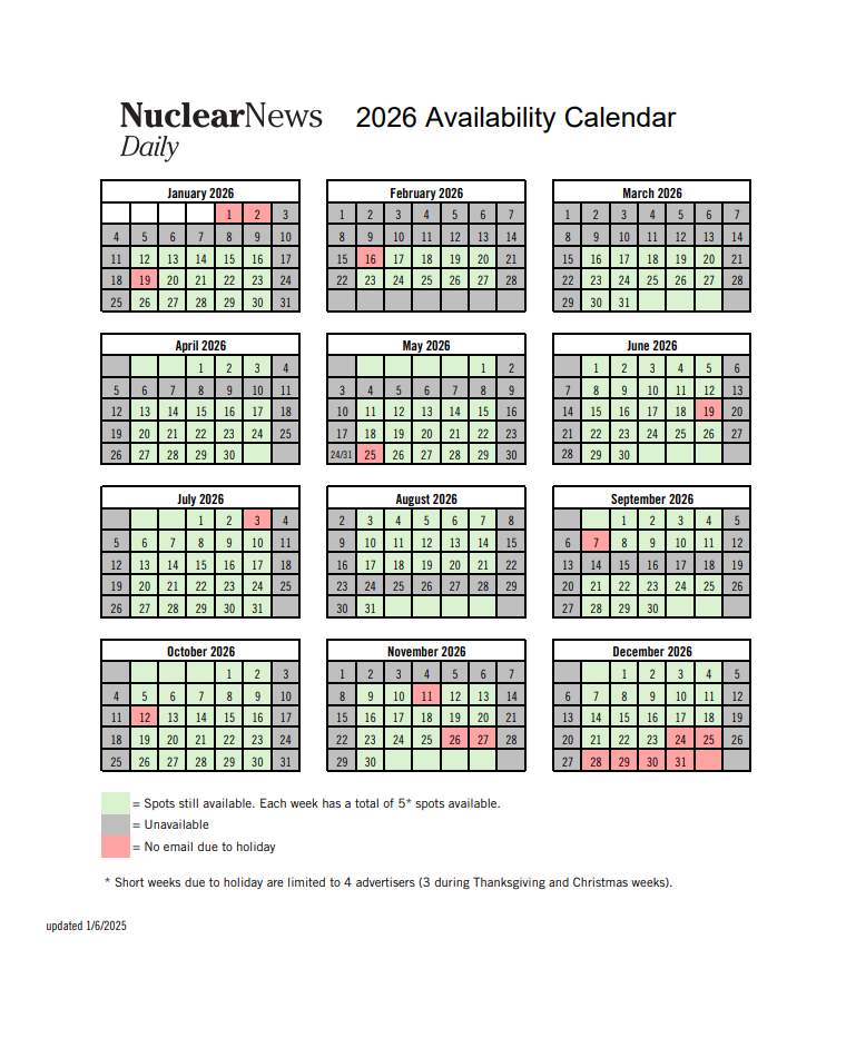Nuclear News Daily is a trusted resource for professionals across the globe. With five high-visibility ad positions each week, your marketing message will be seen by the worldwide nuclear community.