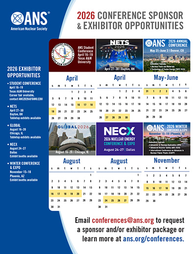 For more than 65 years, the American Nuclear Society has provided a forum for advancing the state of applied nuclear science and technology. ANS meetings and conferences are the best way to keep current with the ever changing fields of nuclear science and technology.