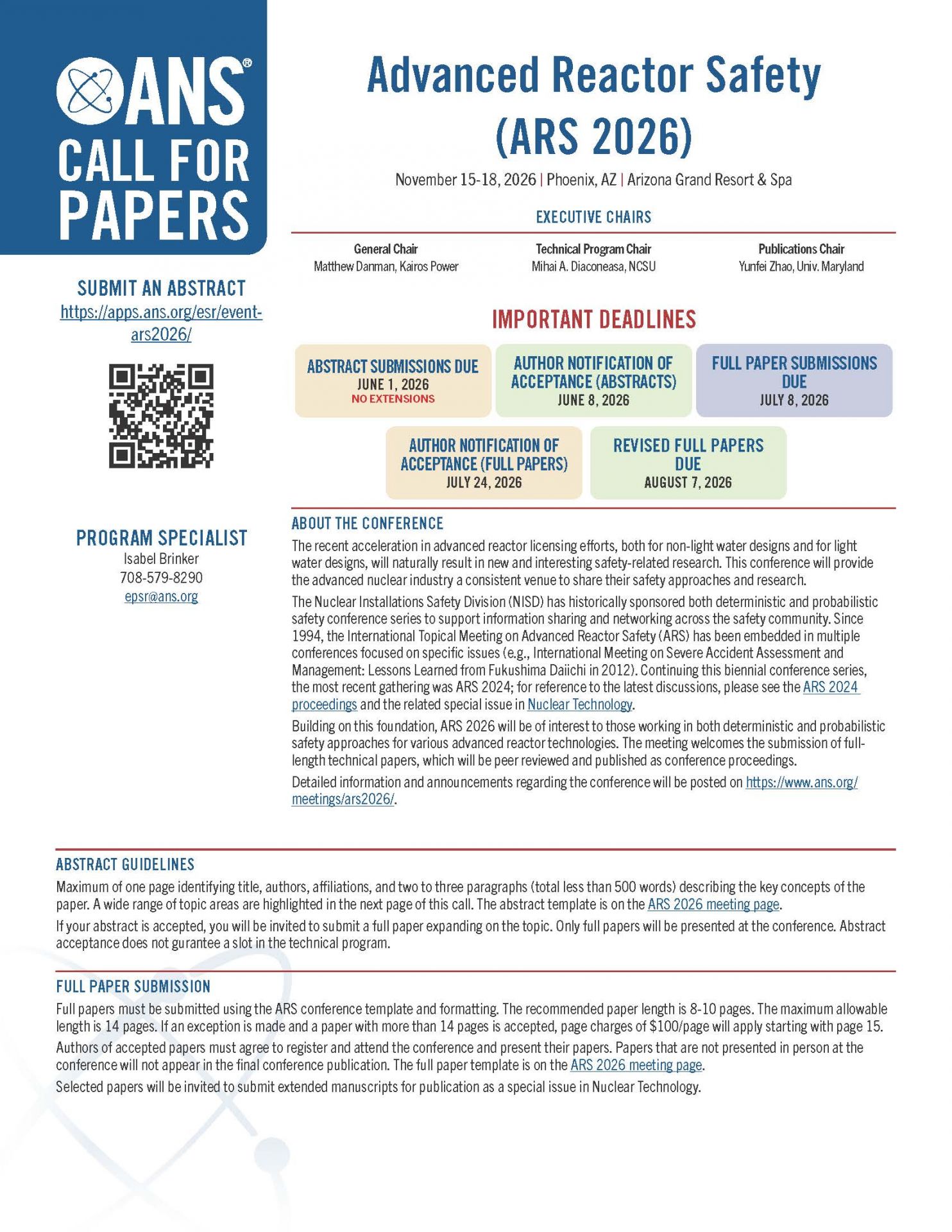 This conference provides the advanced nuclear industry a venue to share their safety approaches and research. The Advanced Reactor Safety (ARS) conference, formerly entitled the International Topical Meeting on Advanced Reactor Safety and first held in 1994, is one of two conferences the Nuclear Installations Safety Division (NISD) has historically sponsored to support information sharing and networking across the safety community. ARS 2026 will be of interest to those working in both deterministic and probabilistic safety approaches for various applications. The meeting welcomes the submission of full-length technical papers, which will be peer reviewed and published as conference proceedings.