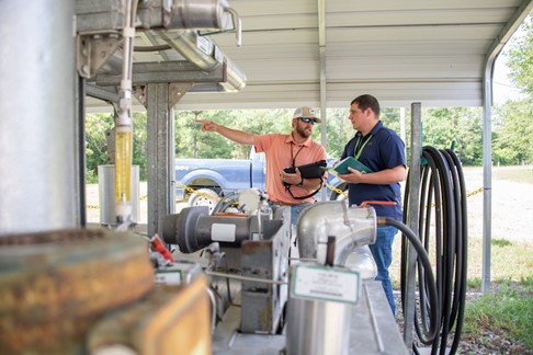 F Area operator Thomas Harman (left) and SRNS scientist Kevin Boerstler check the pumps, sensors, and piping that blend a base concentrate to inject into acidic groundwater at the Savannah River Site. (Photo: DOE)
