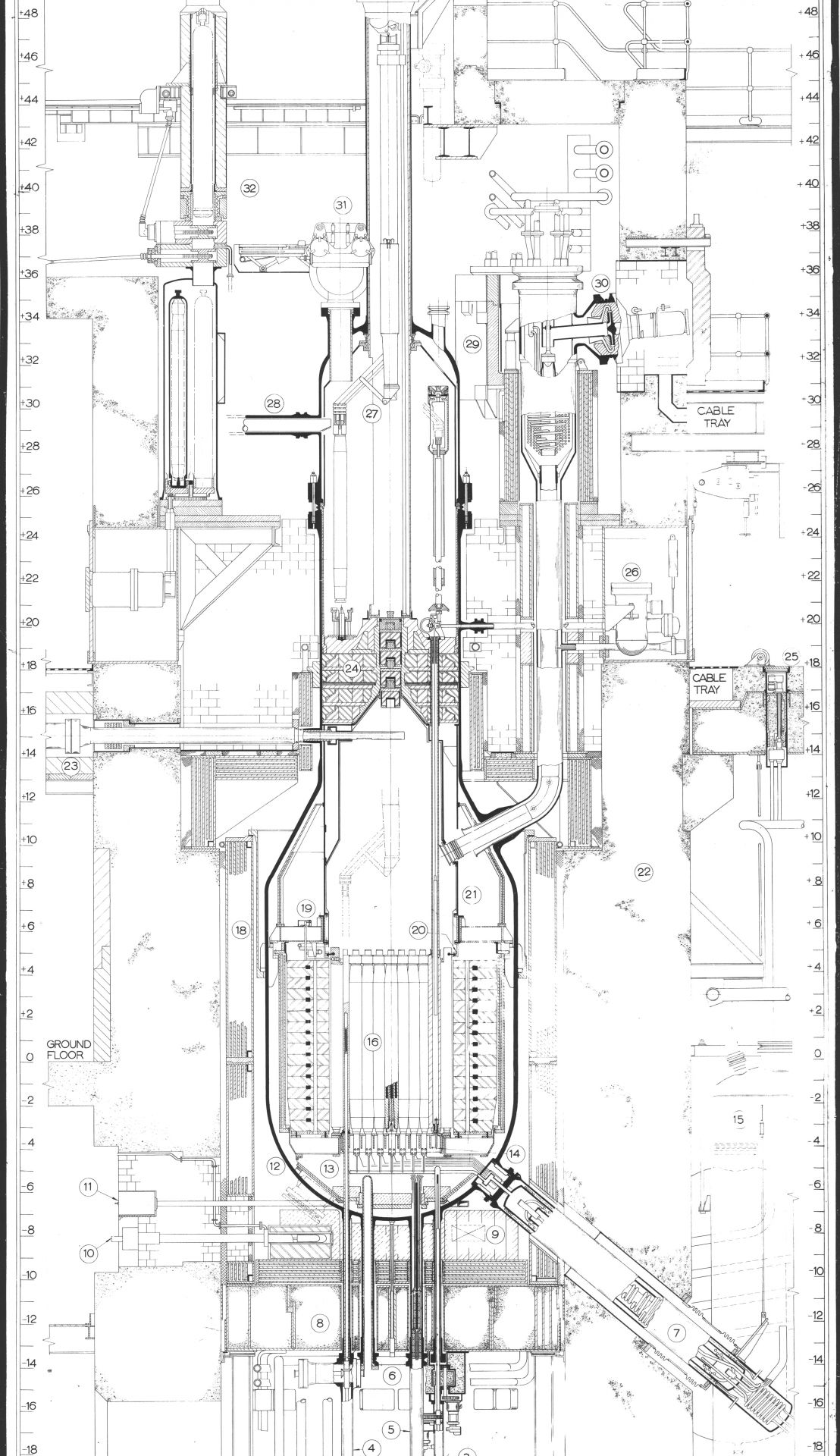 Figure 1 shows an original sectional view of the reactor alongside a historic photograph of the upper biological shield wall housing the charge machine and upper part of the RPV during the operational phase.