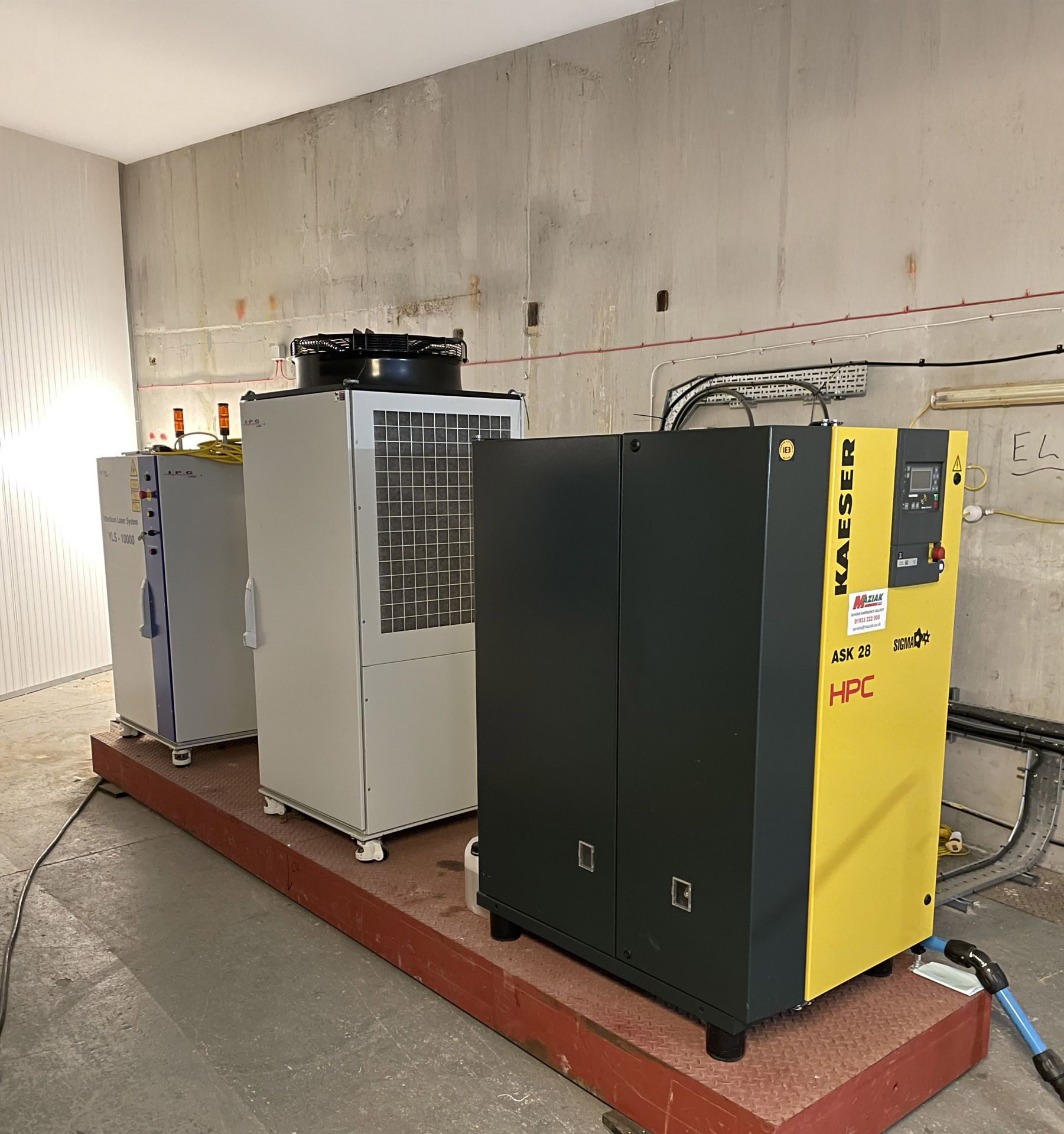 The laser source, optical fibers, and the chiller. The optical fibers are more than 80 m in length and have a core diameter of 200 micrometers. Chilled water is fed to the process head optics through the energy chains.
