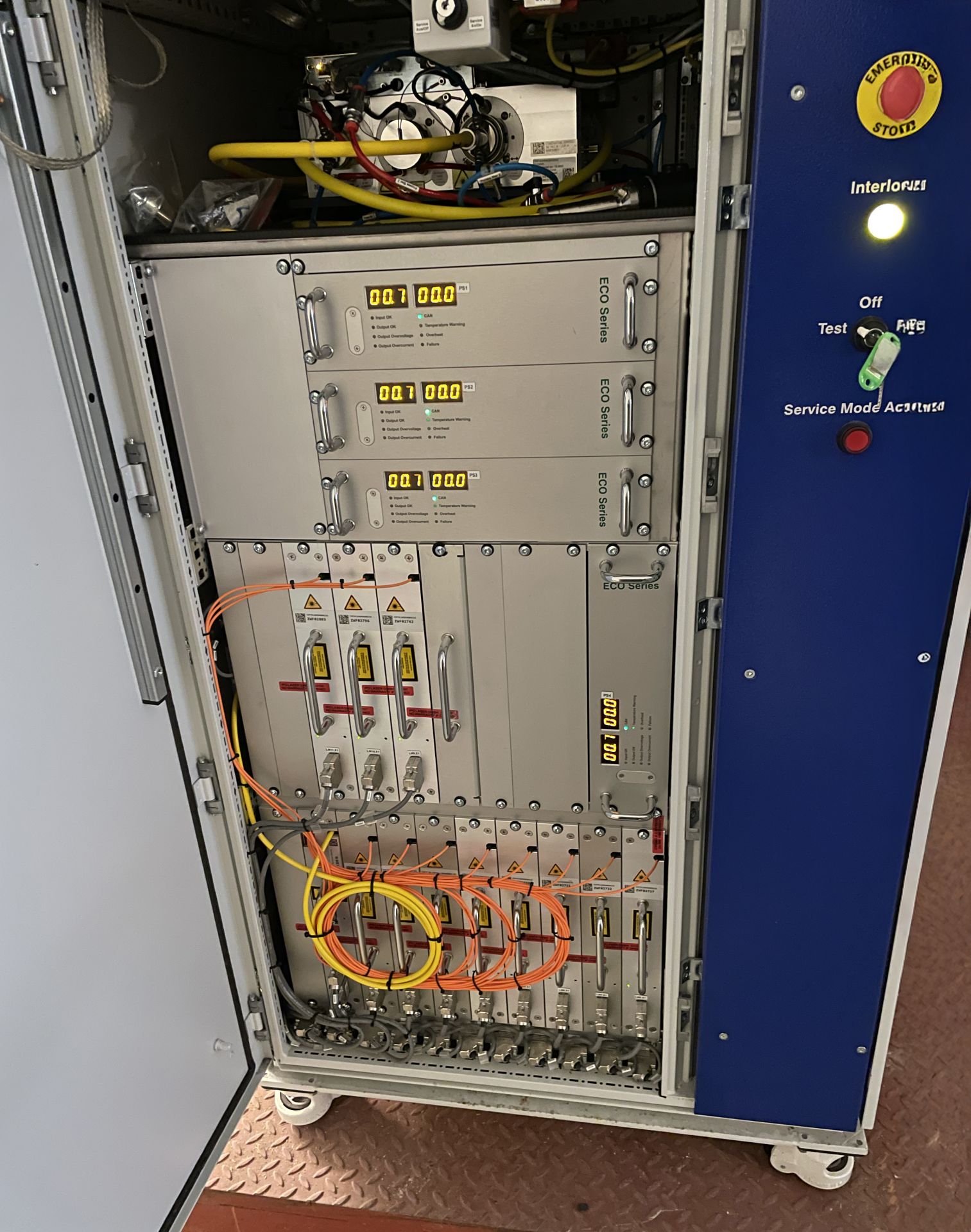 The laser source itself is a 10-kW IPG YLS-10000 Yb continuous-wave fiber laser that operates at a wavelength of 1070 nanometers, in the near-infrared part of the spectrum. Internally, the laser contains 11 independently selectable laser modules that are then combined to produce a single-output feed fiber. In normal operation, all 11 modules are activated and their pump current attenuated according to the required level of laser output power. Should a fault occur with any module (the Dragon project has yet to experience this), they can be deactivated to allow uninterrupted laser operation at reduced power until a replacement can be made. The feeding fiber is connected to a two-way beam switch inside the laser source, which allows the user to select an output channel for the laser into which the process fibers can be installed and which are responsible for transmitting the laser energy to the process head. Chilled water is continuously fed through the laser source and process head optics by a dedicated unit.