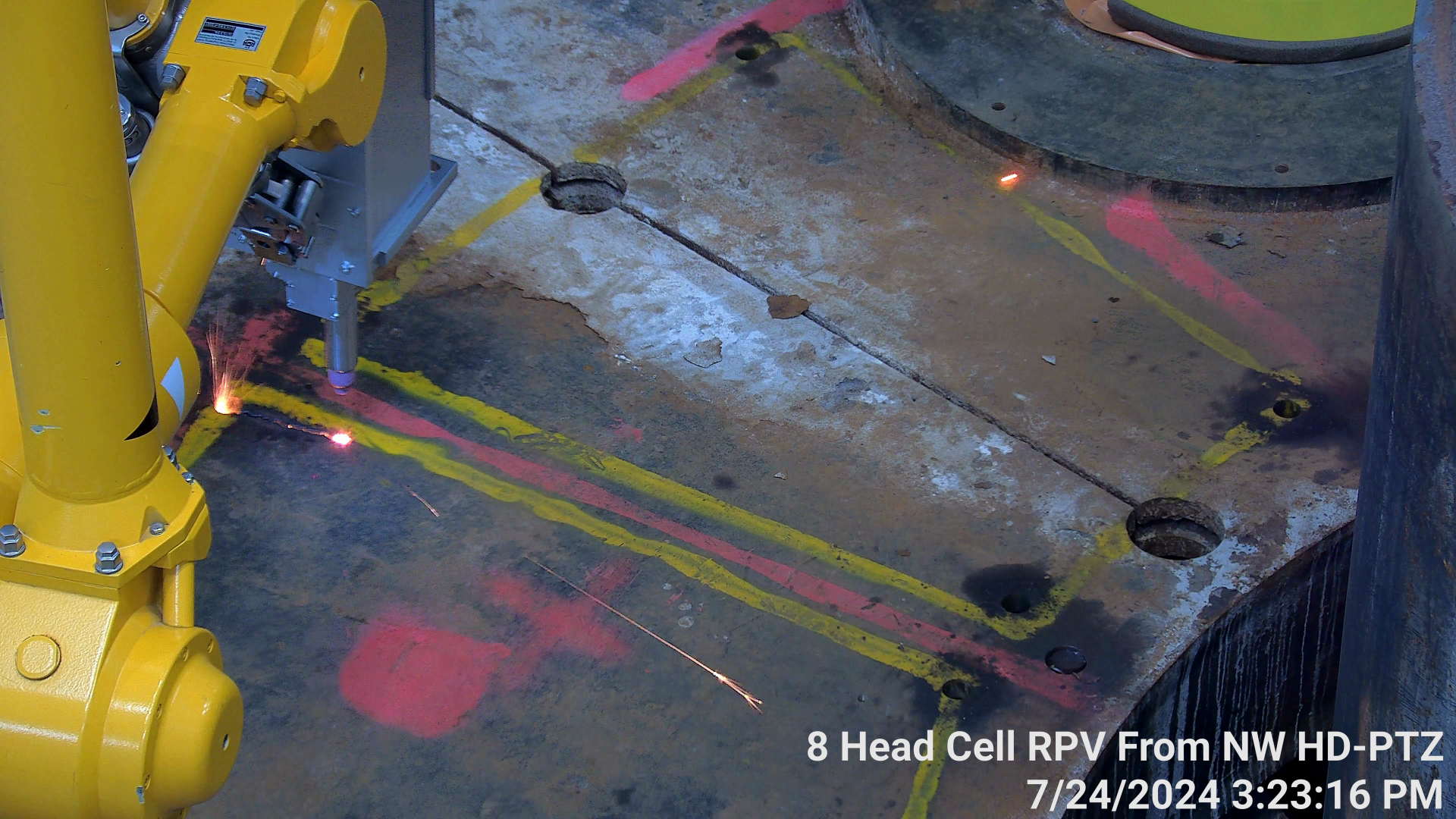 Trials were undertaken at Onet Technologies’ Technocenter in France using a 14-kW laser mounted to a STAUBLI robotic arm within a ventilated cutting cell. Based on the most challenging cutting operations anticipated as part of reactor dismantling, four general test pieces, each designed as a direct replica of a reactor dismantling cutting scenario, were cut. The test pieces were subjected to numerous trials with different cutting configurations to maximize useful data gathered from the trials. Data of interest for each test piece were minimum and maximum standoff distances, minimum laser power requirements, optimum cutting head travel speed, and any other limitations observed.