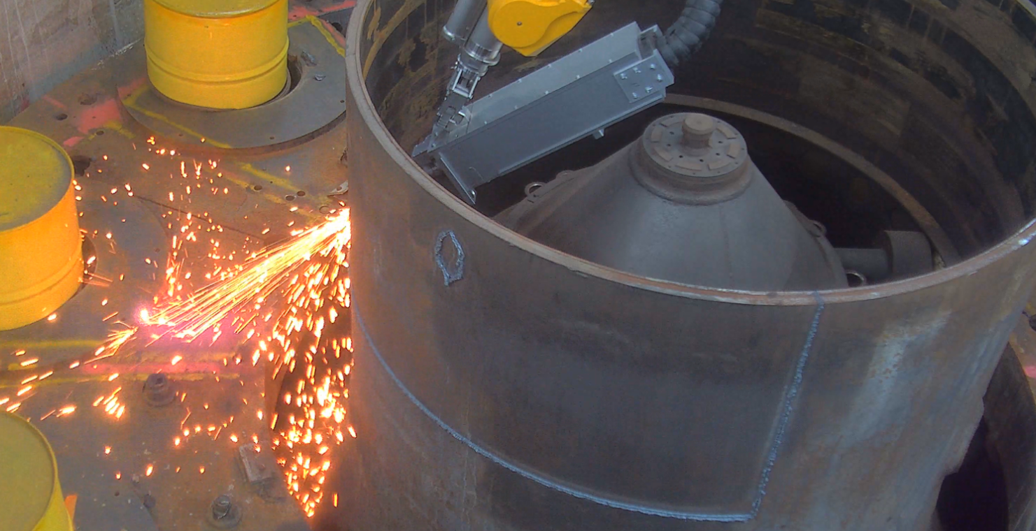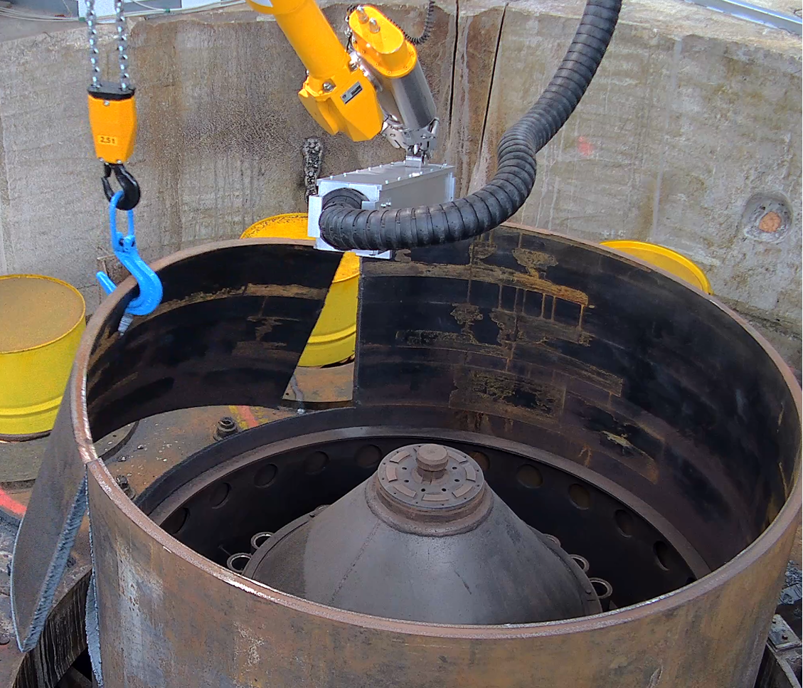 More recently, one of the structures the project has contended with removing is a section of the RPV neck that protrudes above the reactor plenum chamber (Fig. 5). Removal of this neck was originally scheduled to be completed following segmentation of the TRTS, however an opportunity to improve the available operating range of the RCSM was identified by executing this task early. Over the course of three days of operation, the neck was removed and exported in sections each weighing approximately 0.5 t. Use of the laser-cutting system to create handling holes for recovery of each section proved to be a particular point of success. The removal of this part of the RPV neck posed a very different challenge to the TRTS and was excellent confirmation of the realizable range of practical capabilities possessed by the laser-cutting solution and of its subsequent application to other structures within the RPV.