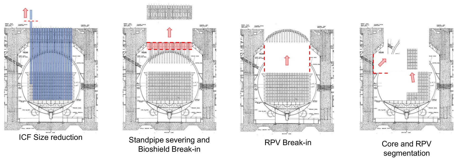 Different aspects of each of the individual concepts were assessed, with the favorable aspects of each taken forward as a basis for the design of the dismantling scheme. From the concept designs, a suite of waste campaigns was established that broke the reactor dismantling down into sequential steps based on the components for removal and processing. Figure 6 shows the sequence of work to dismantle the reactor.