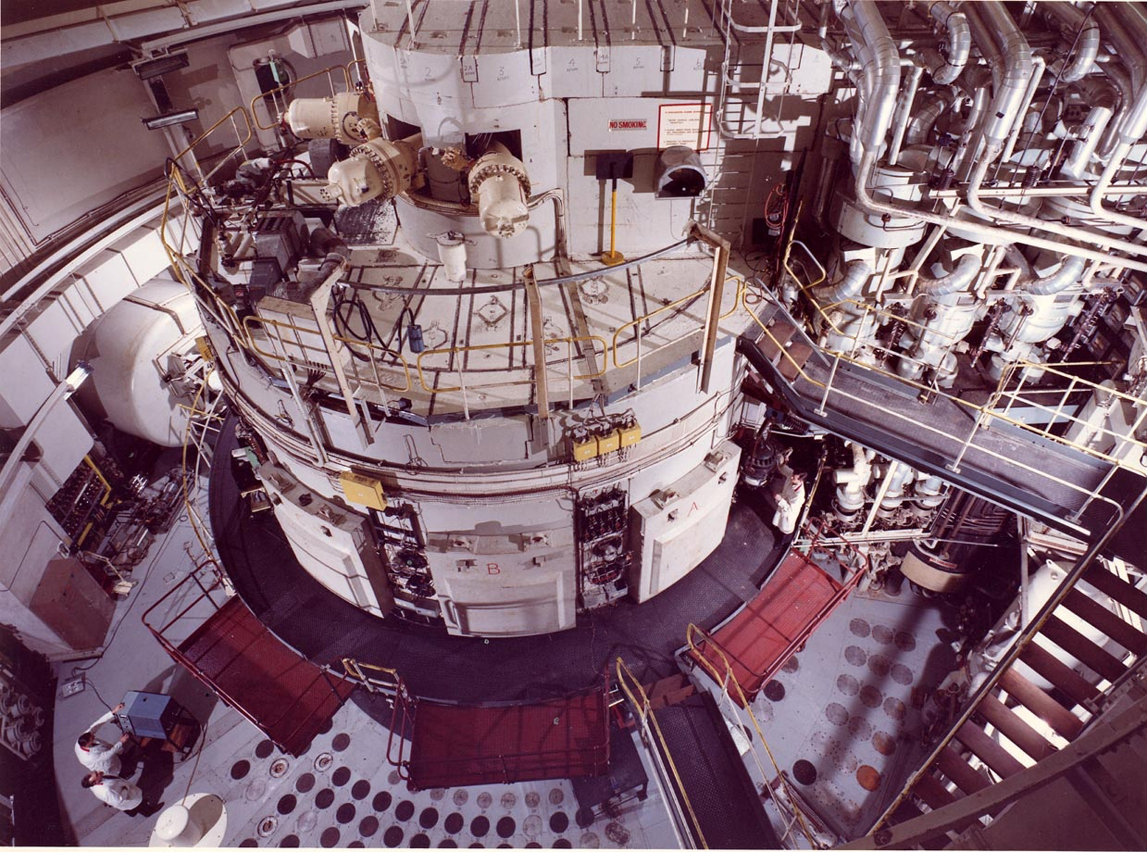 Figure 1 shows an original sectional view of the reactor alongside a historic photograph of the upper biological shield wall housing the charge machine and upper part of the RPV during the operational phase.