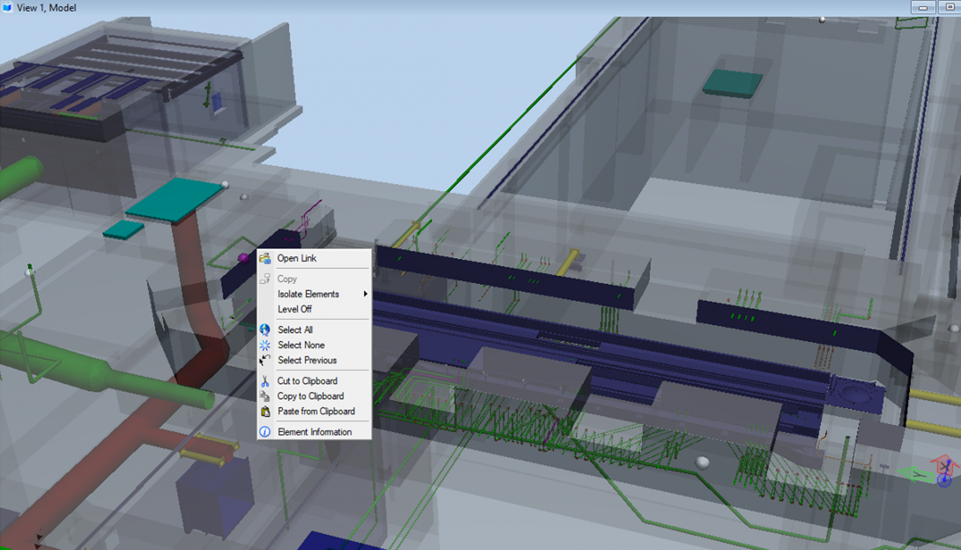 The measuring tool within the 3D model was useful for planning MPPB demolition. Measuring reach requirements for heavy demolition equipment can be determined using the 3D model. Distance between areas of concern can also be easily determined. Thickness of walls, lengths of pipe or steel members, and elevations and distances between penetrations can be determined within a few moments on the computer, increasing workflow and decreasing downtime referencing cumbersome amounts of cross-referenced drawings (Fig. 3).