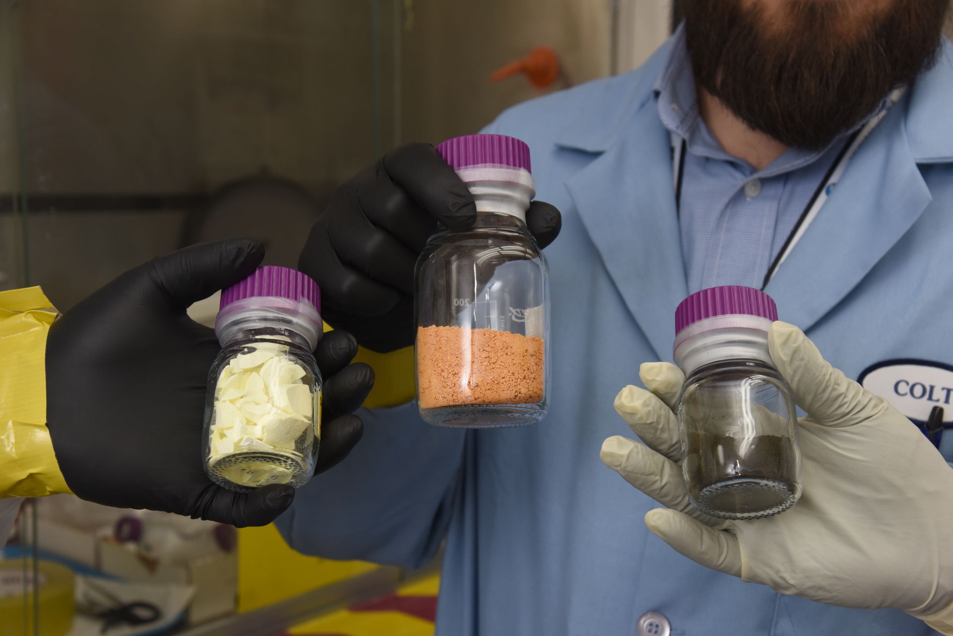 INL researchers have processed HALEU reguli by dissolving the metal in acid, purifying it by solvent extraction, and precipitating and converting the purified HALEU into solid forms. From left to right are solid UO4, UO3, and U3O8. (Photo: INL)