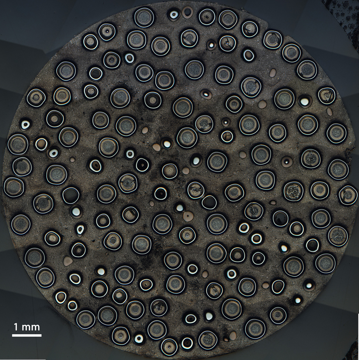 Cross section of 12-mm fuel compact containing dozens of individual TRISO particles. (Photo: INL)