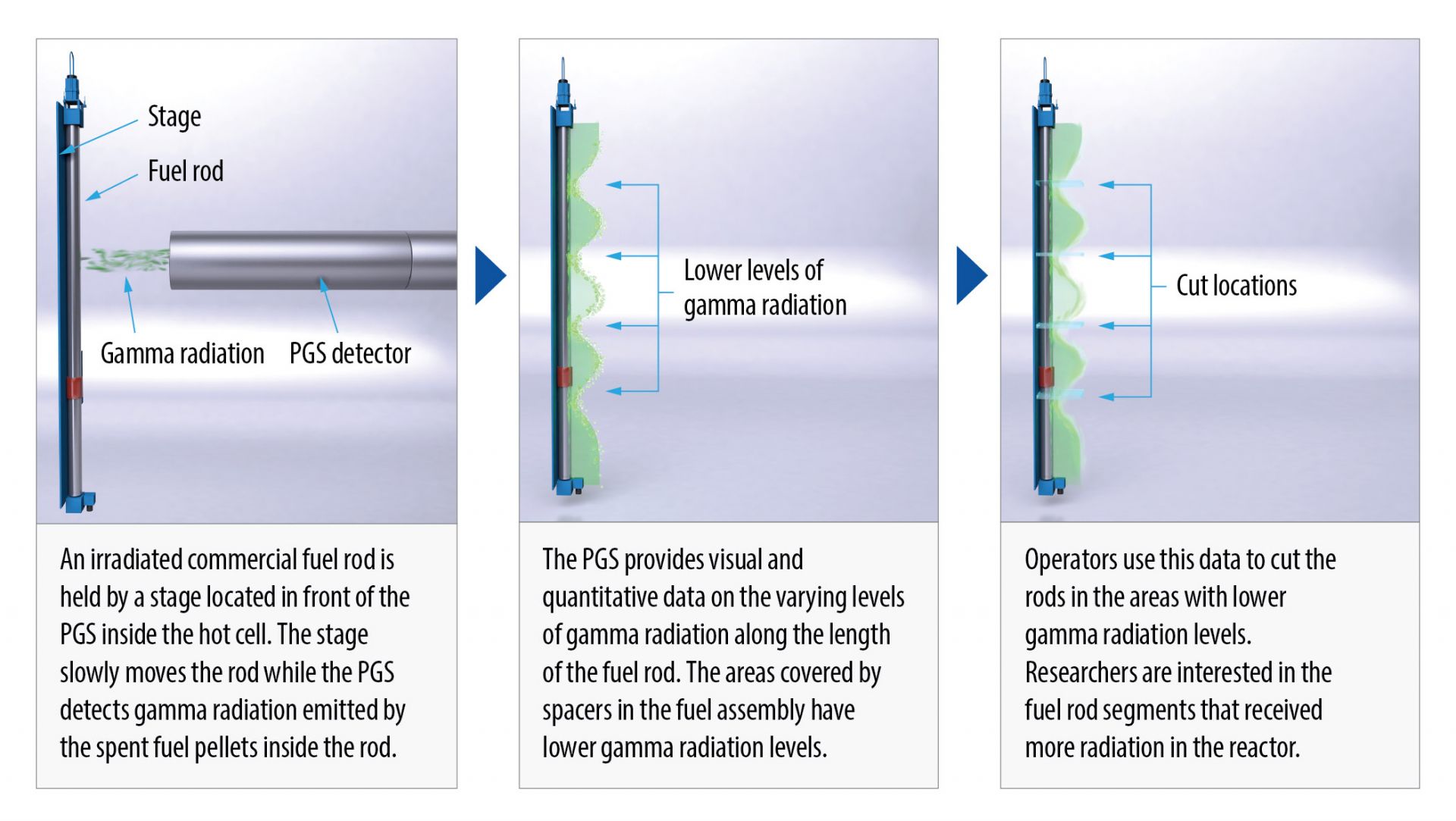 Illustration of the precision gamma scanner (PGS) process for rod sectioning. (Image: INL)