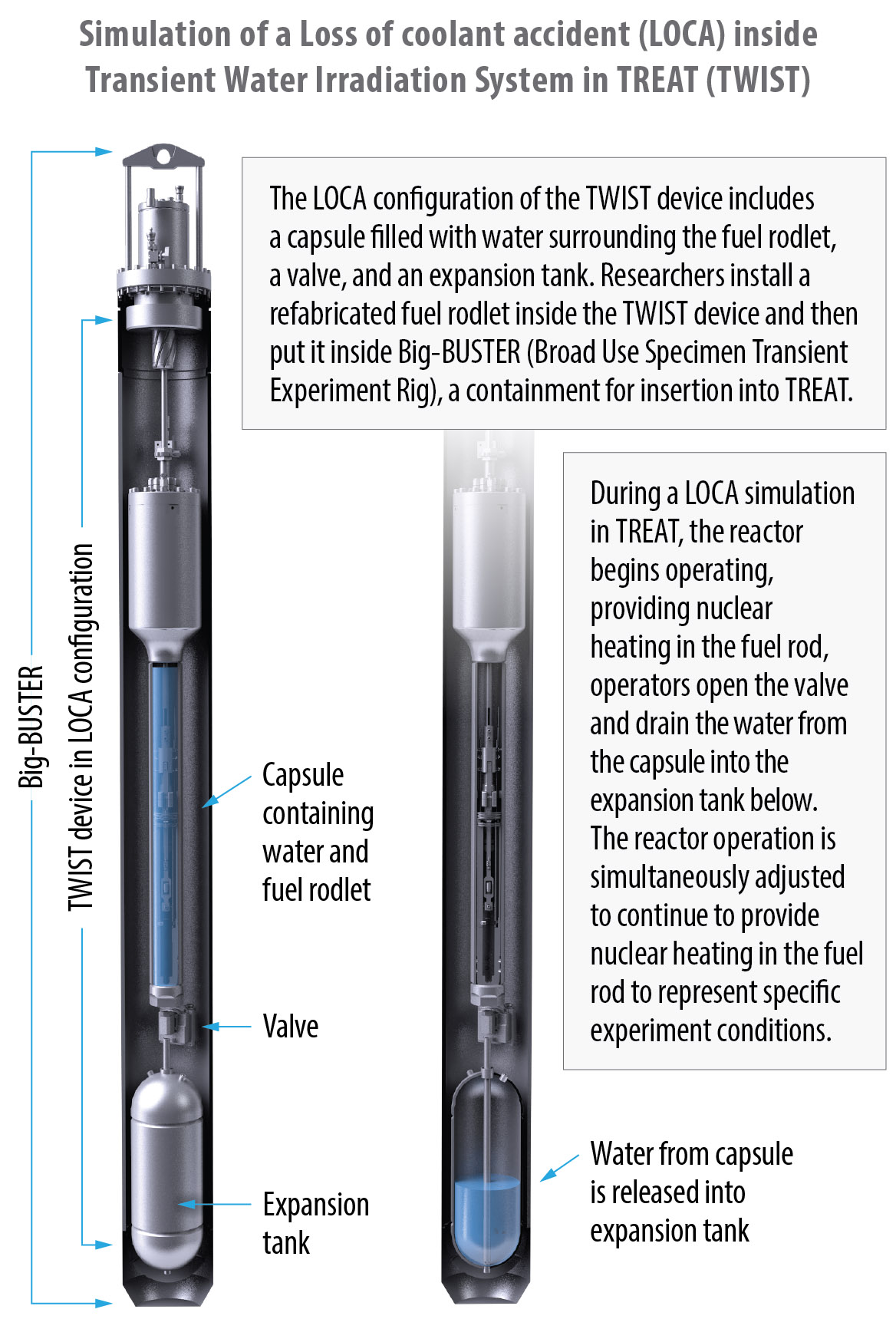 During a LOCA test, TREAT reactor operators bombard the fuel, surrounded by water, in the TWIST capsule with an intense burst of radiation for around 30 seconds. This burst of radiation establishes thermal conditions like a normal operating fuel pin in a commercial reactor. Then, the accident event simulation starts by draining the water into an empty tank at the bottom chamber of the TWIST capsule.