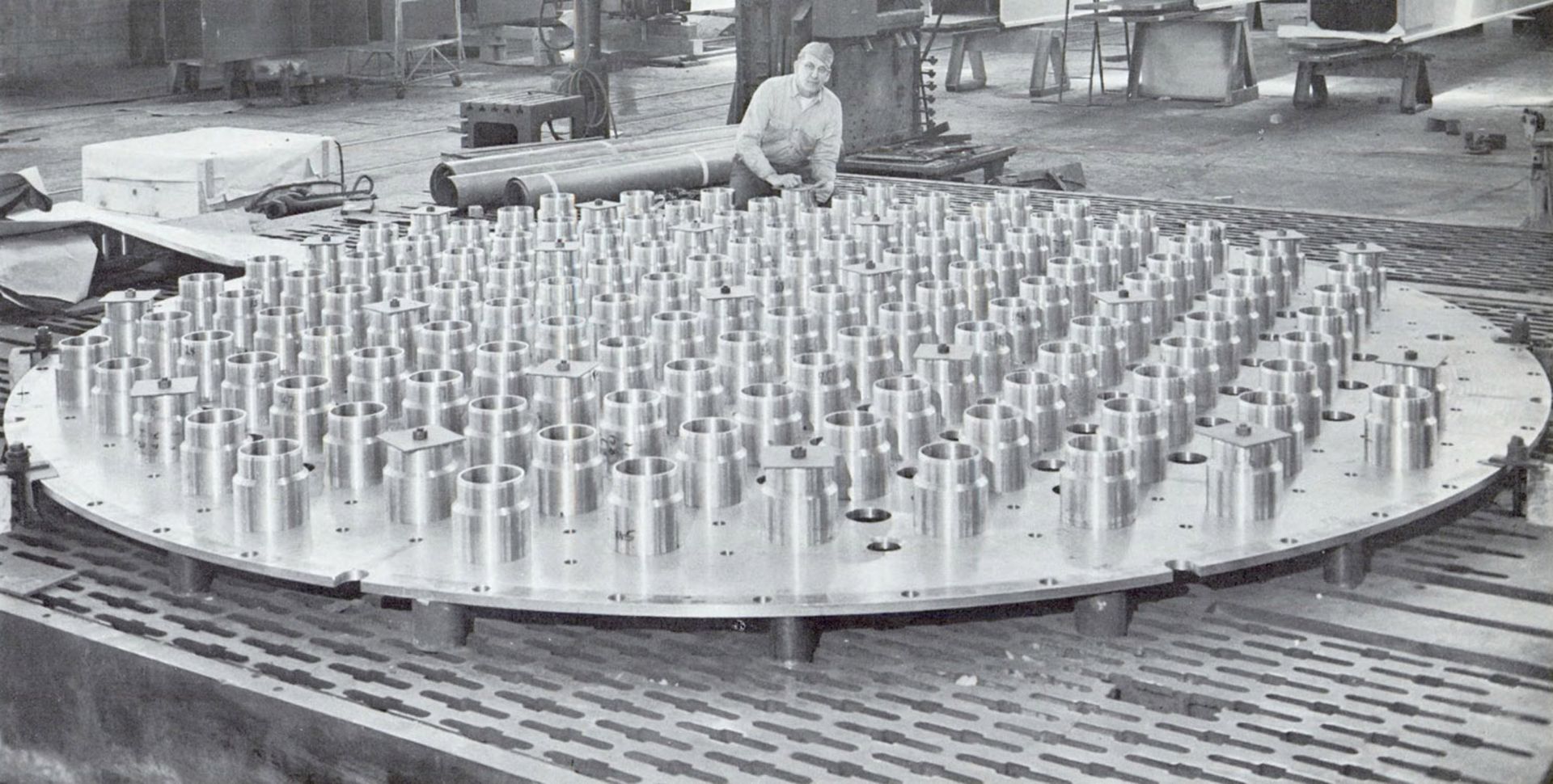 Grid plate with 141 moderator can supports placed in preparation for securing to the grid plate. (Photo: J. E. Mahlmeister/public domain)