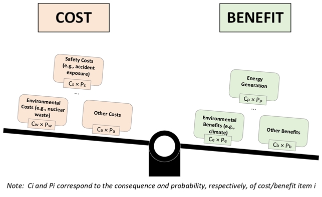 Figure 1. Example of a cost-benefit analysis for efficient and safe nuclear licensing. This framework illustrates how safety risk, traditionally quantified through PRA, must be combined with other relevant cost and benefit dimensions to meet statutory expectations of efficiency.