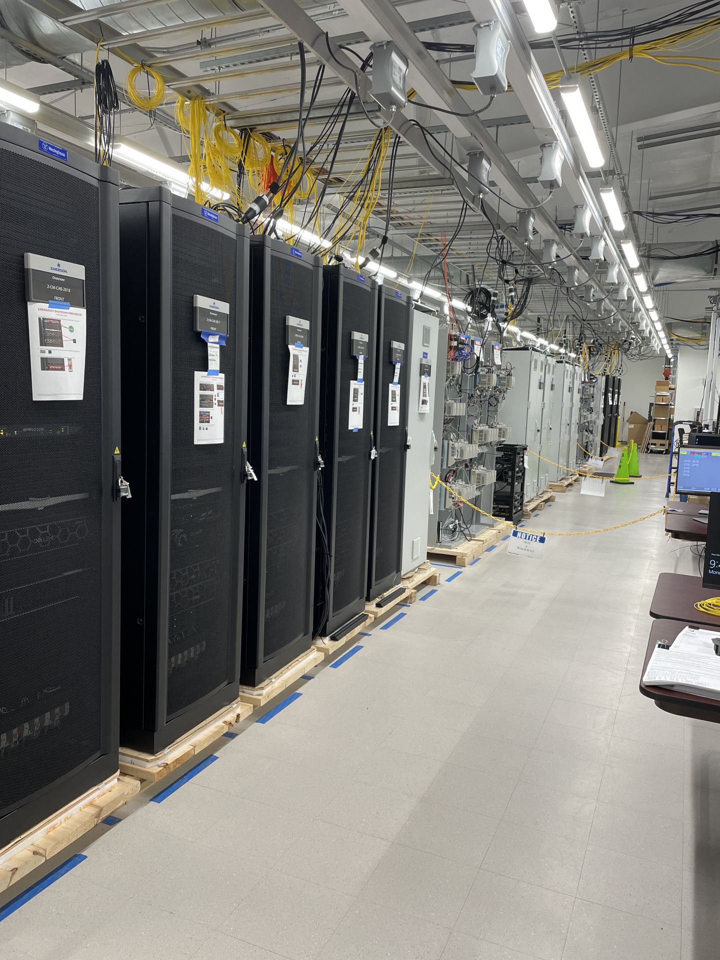 A row of communication cabinets (black, foreground) and control cabinets being tested in Surry’s CSTF. (Photo: Dominion)