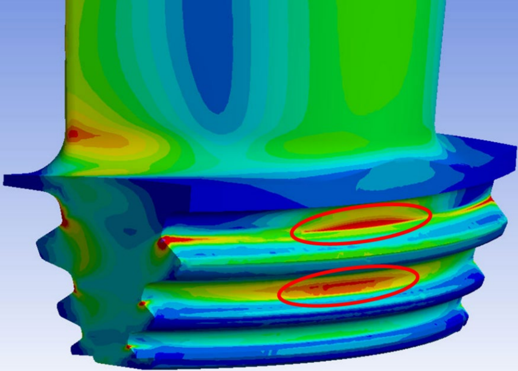 Finite element analysis of a rotor blade and blade root shows areas that are more likely to be susceptible to stress-corrosion cracking. (Image: Constellation/SIA)