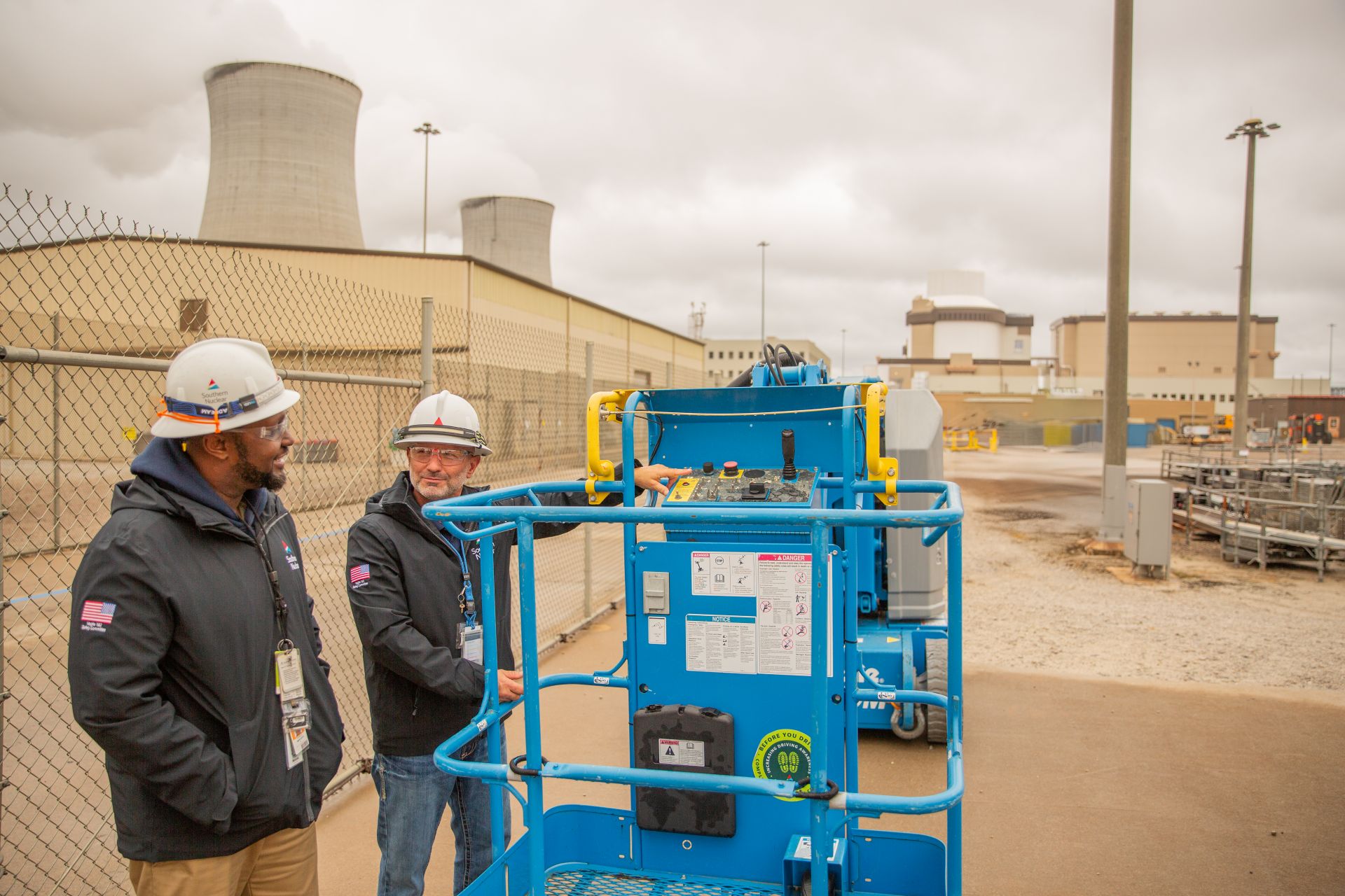 Plant Vogtle employee-owned safety program lead Rich Merjuste (left) and Plant Vogtle safety coordinator Brian Vallee perform a safety walkdown using references from the Safety Advisor Copilot agent. (Photo: Southern Nuclear)