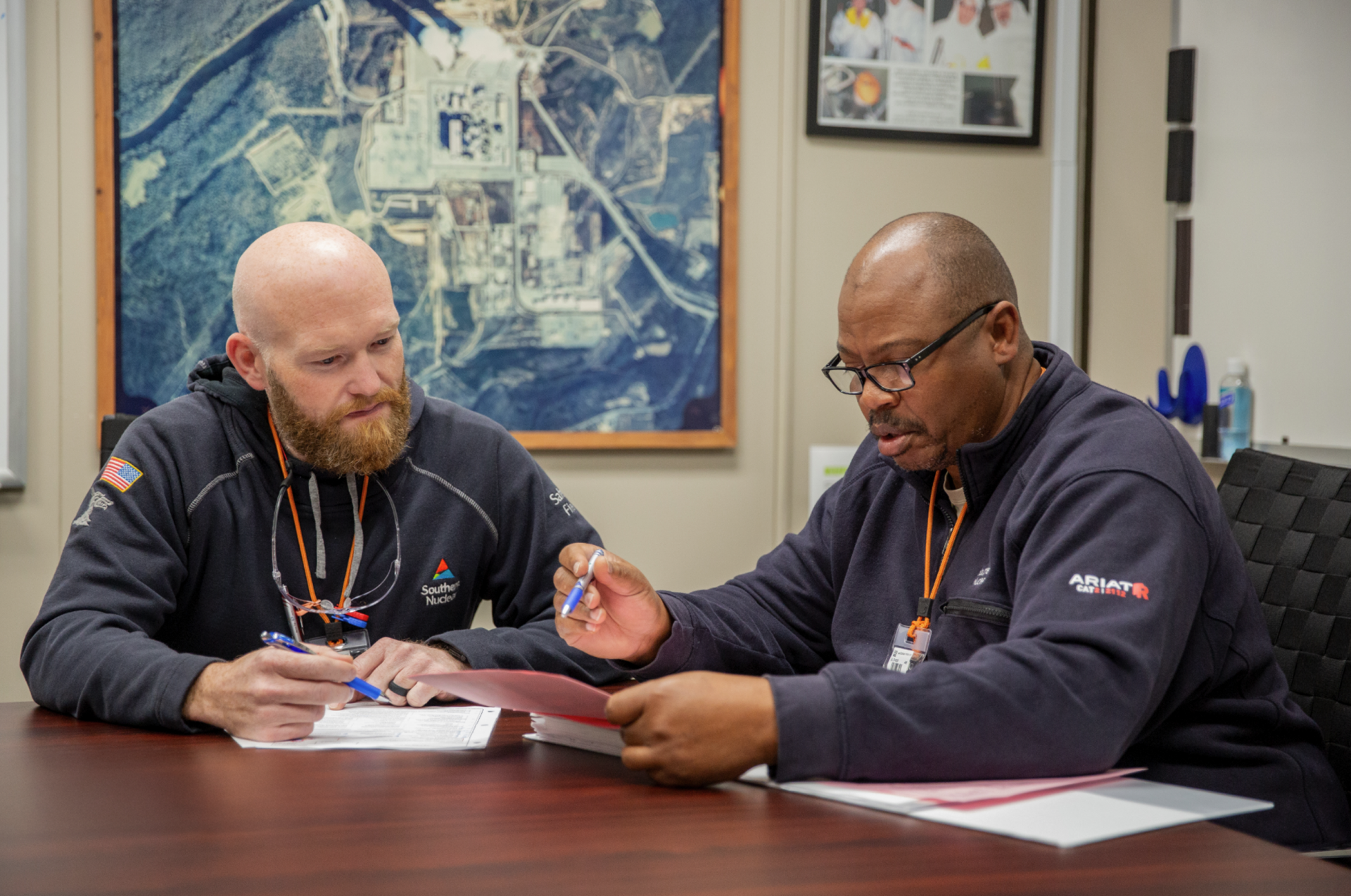 Maintenance I&C technicians Jonathan Cox (left) and Anthony Glover use information from the OE AI agent to prepare for plant maintenance activities. (Photo: Southern Nuclear)