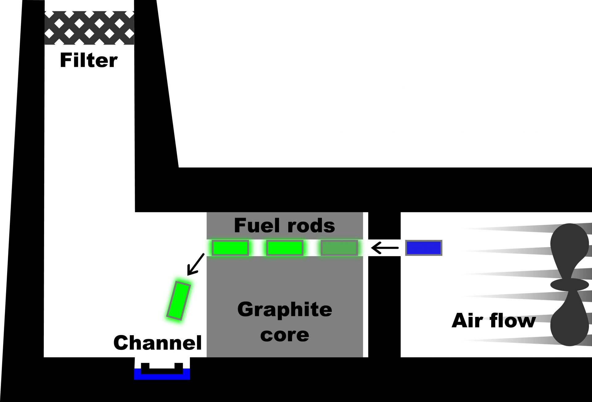 In the reactor design, fuel channels ran horizontally to the core and were surrounded by graphite. The chimney, located at the back of the pile, would carry heat away through natural convection. Industrial fans positioned at the front of the core could be turned on to enhance the effect of natural convection. Each fuel cartridge was about one foot in length and was protected by a finned casing. The fuel was loaded into the core from the front of each pile, and as each new cartridge was added, previously irradiated cartridges, which now contain plutonium, were pushed out the back side to fall into a pit of cooling water.