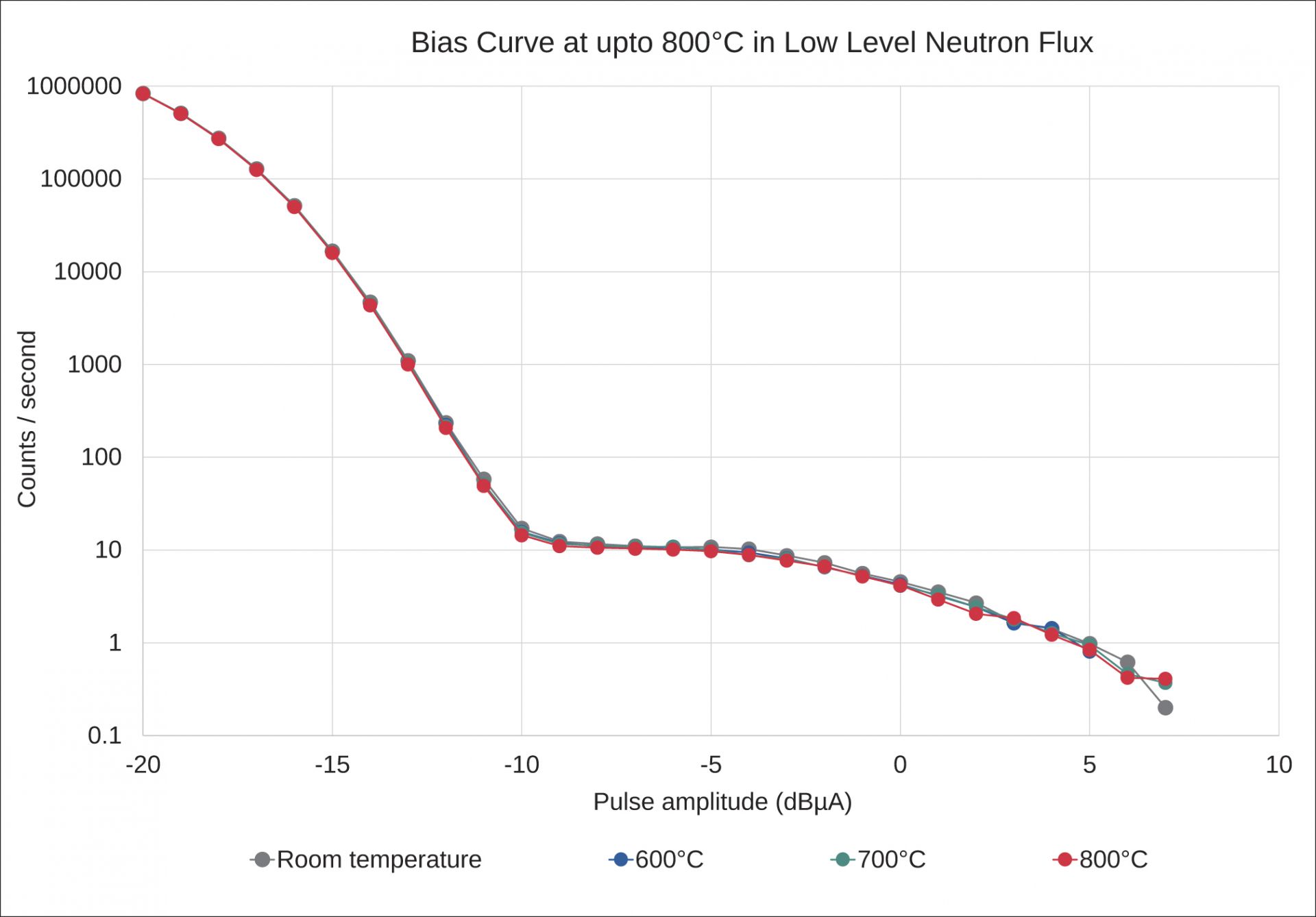 A subset of test data is shown below confirming stable behavior, stable signal-to-noise characteristics, and linear response to neutron flux when operating at up to 800°C. The first plot shows a bias curve in a fixed low level neutron flux (consistent with reactor start-up) at various temperatures with consistent results.