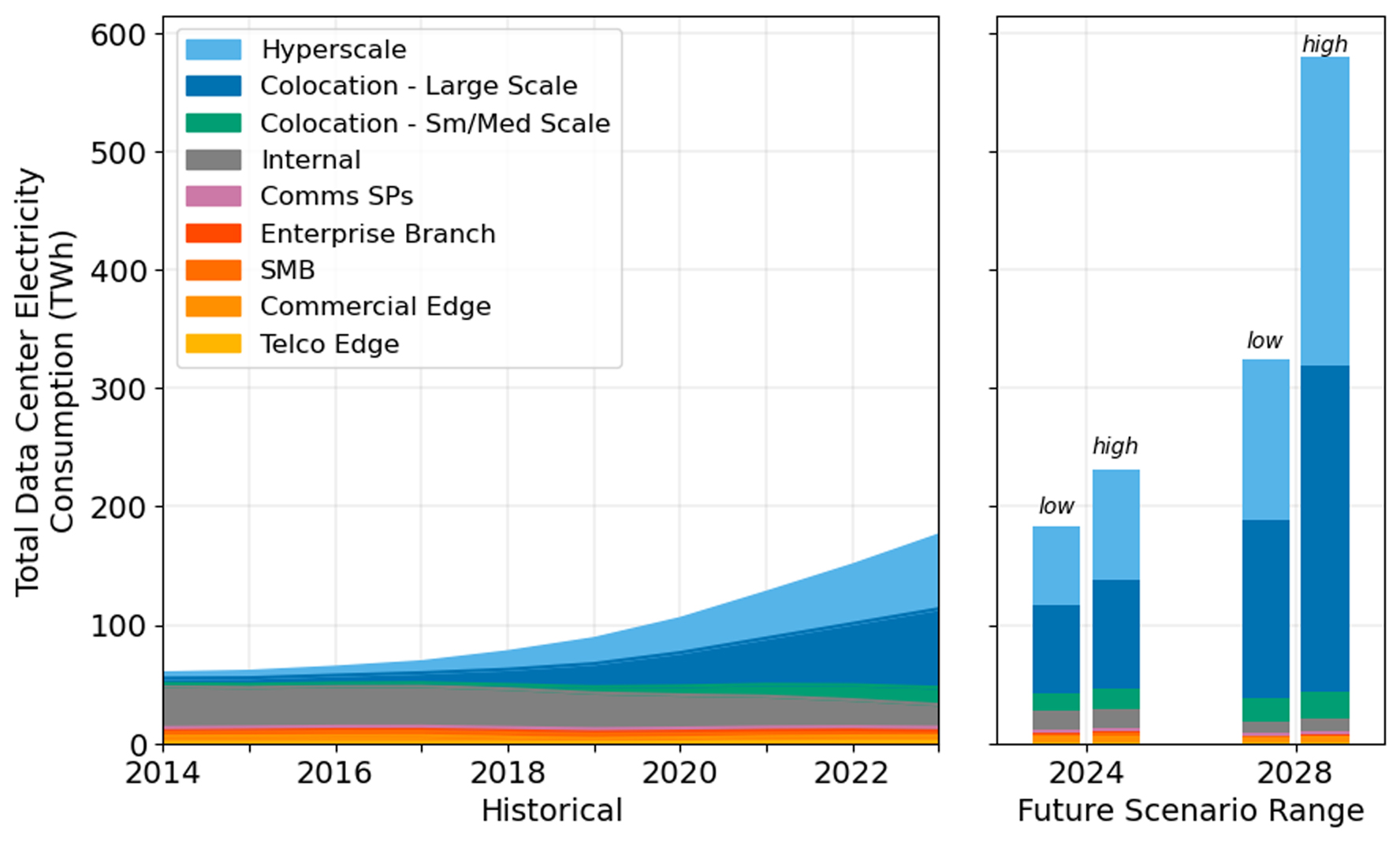 Chart 2. Total data center electricity use, 2014–2028, by space type.