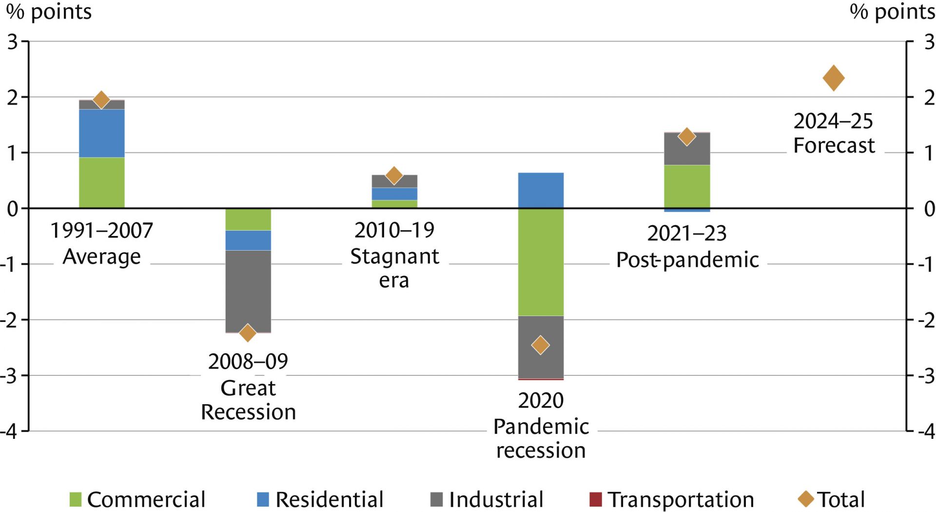 Sources: See Nida Çakır Melek and Alex Gallin, “Powering Up: The Surging Demand for Electricity,” Economic Bulletin, September 2024 (Public Affairs Department of the Federal Reserve Bank of Kansas City).
