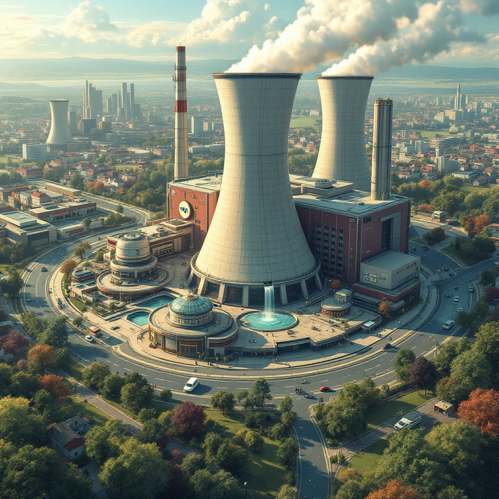 A user-generated depiction of a power plant is described as "a small, intimate fission energy facility in a . . . retrofuturistic future . . . . The community center, a big waterfall and [ring] road are around the reactor." (Image: Imagine Energies)Image caption.