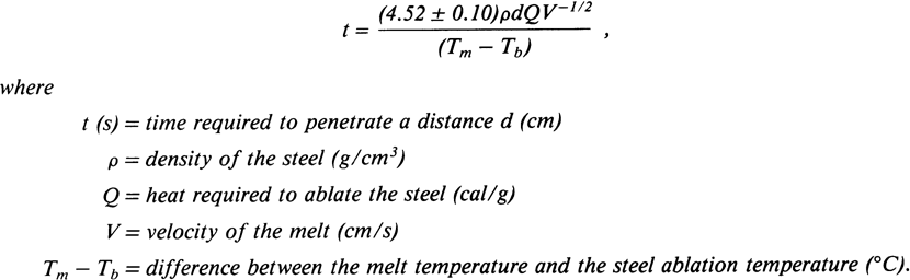 Molten stainless steel at ∼1720°C and melts of iron and alumina or 54 wt% UO2, 16 wt% ZrO2, and 30 wt% stainless steel at 2400 to 2800°C were poured onto 0.95- to 7.62-cm-thick steel structures. The melts rapidly penetrated these structures, probably by a thermal ablation process. Coatings of 0.2- to 2-mm-thick urania on the surfaces of the steel delayed penetration by the very high-temperature melts. Data from tests involving melts impinging on steel structures could be correlated by the single-parameter, empirical expression A finite difference model of the experiments is described. The model is used as the basis for predicting the extent of crust formation when melts contact cold steel and to suggest that a gas gap may form between the steel and any crust of frozen material that does form.