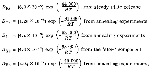 The fission-product release of spherical monogranular UC2 particles is studied by postirradiation annealing of neutron-activated samples and by exposing samples to a steady rate of photofission. The release of the several fission products studied appears to follow the kinetics and temperature-dependence of an activated diffusional process. The anomalous fast release of a portion of the Xe133 in annealing experiments may be interpreted as being due to release of attached or trapped xenon atoms by a process not following Fick's law. Analysis of the data obtained gives the following diffusion coefficients for krypton, tellurium, iodine, xenon and barium in UC2 (in cm2/sec): The diffusion coefficient for xenon in UC2 shows agreement with the diffusion coefficient for xenon in UO2. A negative activation entropy (-13 eu) for diffusion is indicated.