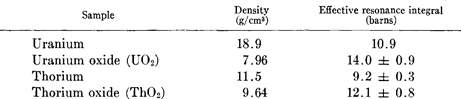 Reactivity measurements on cadmium-clad cylinders of uranium, uranium oxide, thorium, and thorium oxide have been interpreted to yield the following effective resonance integrals. For cylinders all with radii of 1.73 cm and with the listed densities: The results are corrected for nonresonance absorptions of neutrons at energies above cadmium cutoff.