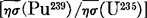 The values of eta for U233 and eta for Pu239 have been determined by a reactivity coefficient measurement. An aqueous solution of each isotope was introduced axially into a critical cylindrical annular flux trap reactor, and the resulting reactivity change was measured by period determinations. From these data the ratios and were obtained. Using recently measured values of eta for U235 and the absorption cross sections in this ratio, the thermal values of 2.317 ± 0.040 for eta of U233 and 2.032 ± 0.053 for eta of Pu239 are obtained. Correction to a neutron velocity of 2200 meters/sec by using the appropriate g-factor gives a value of 2.317 ± 0.040 for eta of U233 and 2.082 ± 0.054 for eta of Pu239.
