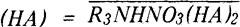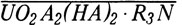 The addition of pelargonic, capric, α-bromocapric, α-fluorocapric, and 3-fluorobenzoic acids to organic trilaurylammonium nitrate solutions significantly modifies the extraction of U(VI), Np(IV), and Pu(IV). Antagonism appears at strong nitric acidities, while enhancement of the extraction of U(VI) and Pu(IV) is observed at weak acidities. The antagonism observed is due to the formation of addition compounds between trilaurylammonium nitrate (R3NHNO3) and carboxylic acids (HA) = for pelargonic and capric acids, and for α-bromocapric, α-fluorocapric, and 3-fluorobenzoic acids. Extraction of UO22+, Am3+, Th4+, Np4+, and Pu4+ by capric, α-bromocapric, and 3-fluorobenzoic acids showed that the extractive power of these carboxylic acids is inadequate for the observation of extraction enhancement. The study of the organic phase by the measurement of nitric acid displacement and by dielectric method shows that trilaurylamine and carboxylic acids react to give the compounds (pelargonic and capric acids) and (α-bromocapric and 3-fluorobenzoic acids). The formation of trilaurylammonium carboxylates is responsible for extraction enhancement. Thus, in the case of U(VI), the compounds formed in the organic phase are (HA = capric acid) and (HA = α-bromocapric and 3-fluorobenzoic acids). The antagonisms observed were successfully exploited to resolve certain problems: