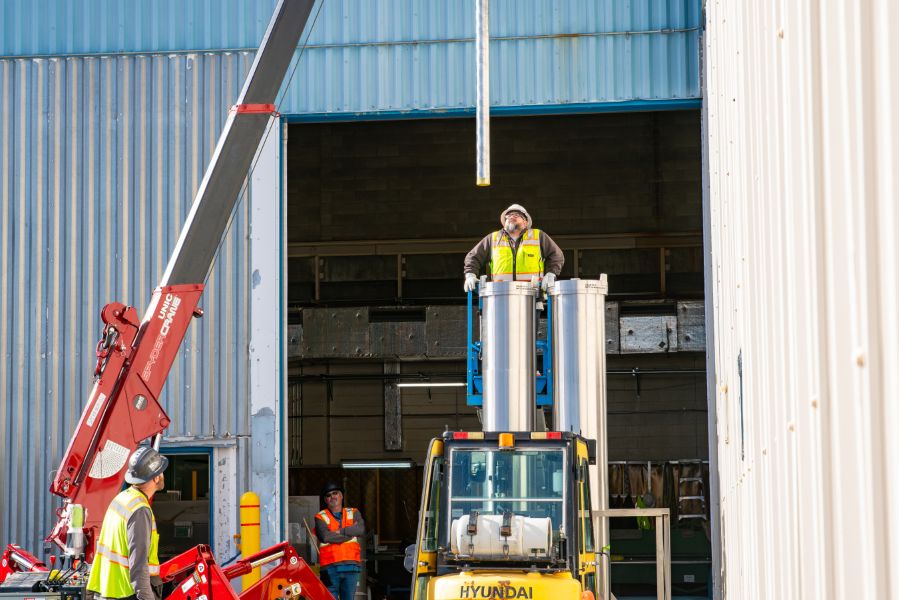 Heavy metal rods are placed into large stainless steel TRIGA spent fuel canisters to test their load-bearing capabilities. (Photo: DOE)